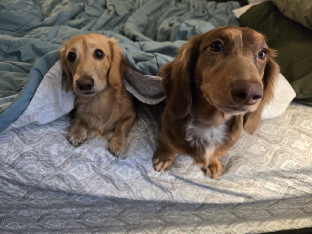 During the day, keep the crate in the same room where your puppy spends time. Leave the door open so they can explore it freely — many puppies will choose to nap there on their own. Once your puppy is fully potty trained, you can decide whether to leave the door open at night (and yes, many Doxie families happily admit to “spooning a Dachshund” now and then!).